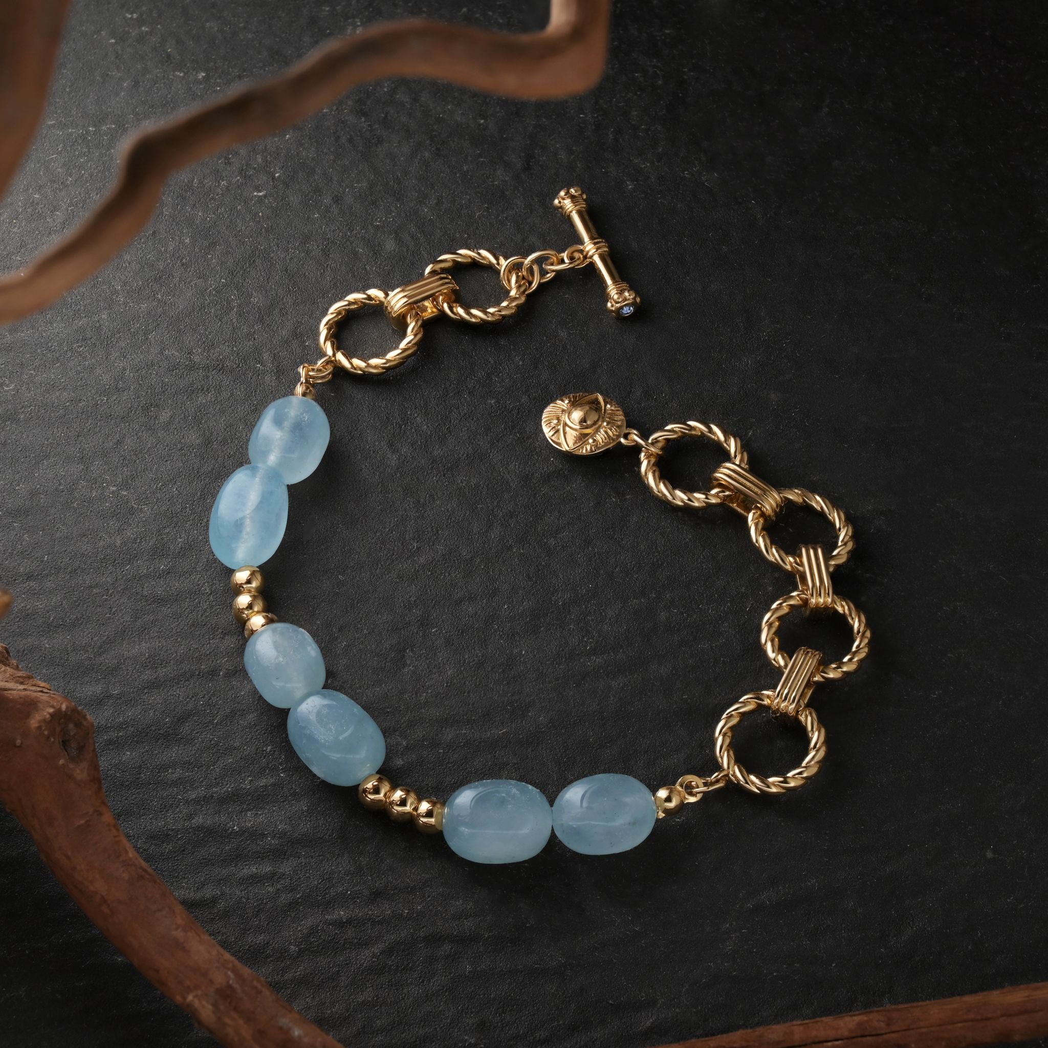 Elevate your style with this gold plated Blue Stone Sappho Bracelet, a timeless collection that radiates elegance and meaning. Crafted with 14k gold plating and adorned with a striking light blue Jade stone, this bracelet captures the elegance with a modern twist. Symbolising confidence, creativity, and grace this bracelet is perfect for day to night wear, adding a touch of glamour to any outfit, a must-have addition to every jewellery collection.