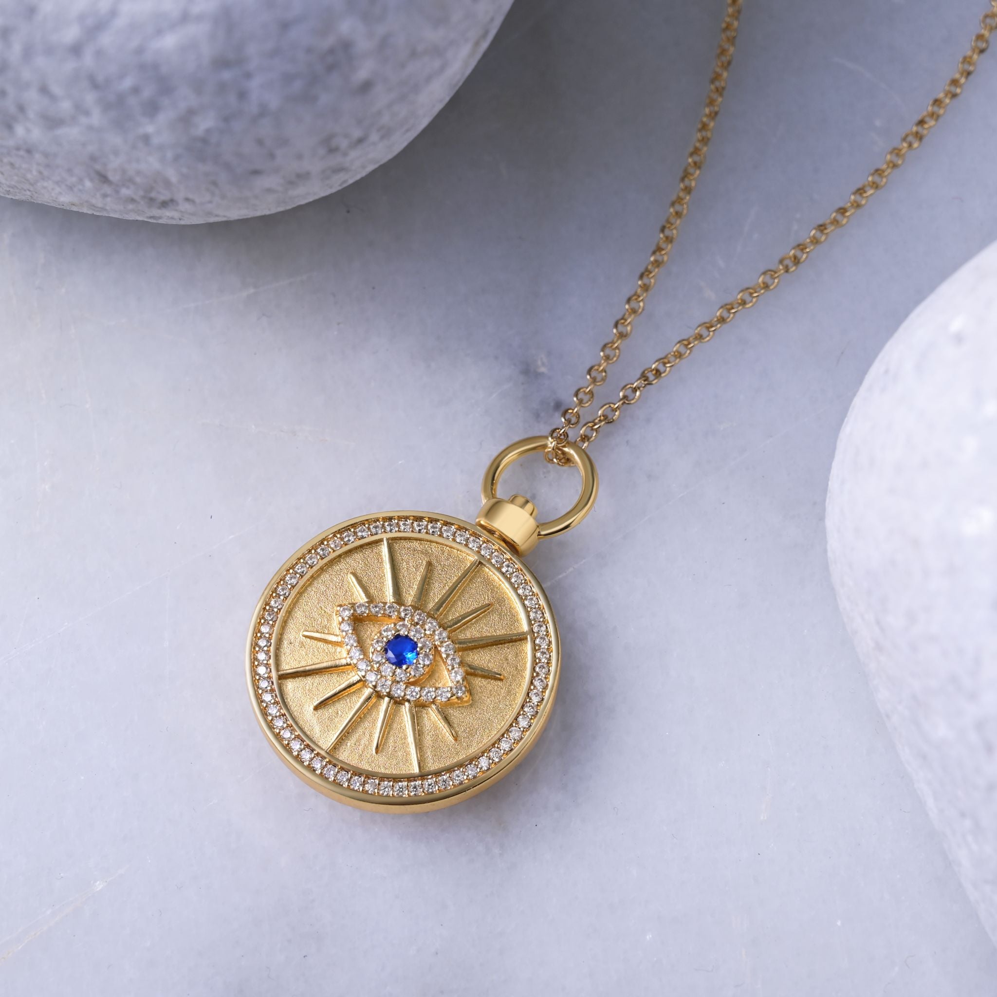 This gold plated Evil Eye pendant from Newbridge Silverware brings timeless symbolism and on trend sparkle together in one statement piece. Crafted with a luxurious 14k gold-plated finish and a vibrant sapphire blue cubic zirconia stone at its centre, this modern design makes perfect for wearing solo or layering with your favourite staple pieces for a fashionable on trend look this season.
