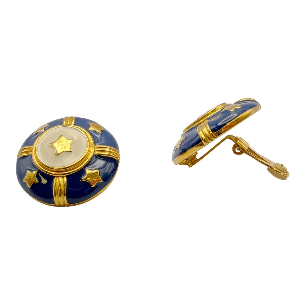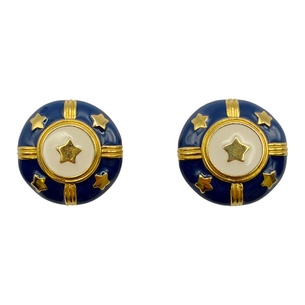 1980's Gold Tone Navy & Cream Enamel Star Earrings